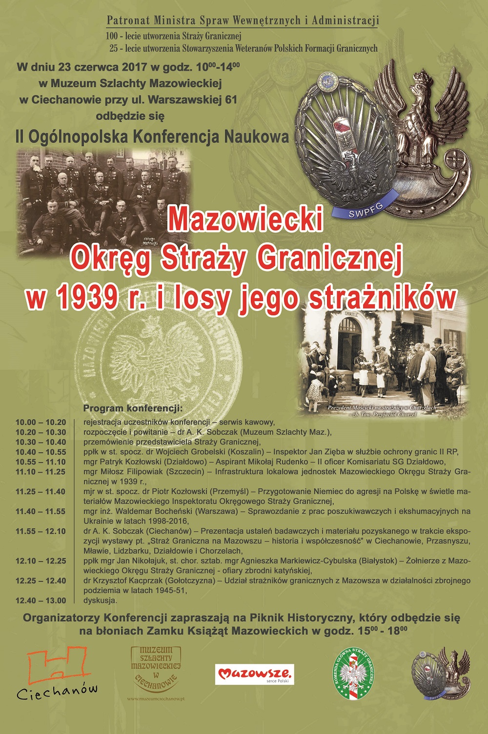 23 czerwca br. w Muzeum Szlachty Mazowieckiej w Ciechanowie odbędzie się II Ogólnopolska Konferencja Naukowa pt.: "Mazowiecki Okręg Straży Granicznej w 1939 r. i losy jego strażników". Patronat nad przedsięwzięciem objął Minister Spraw Wewnętrznych i Administracji.